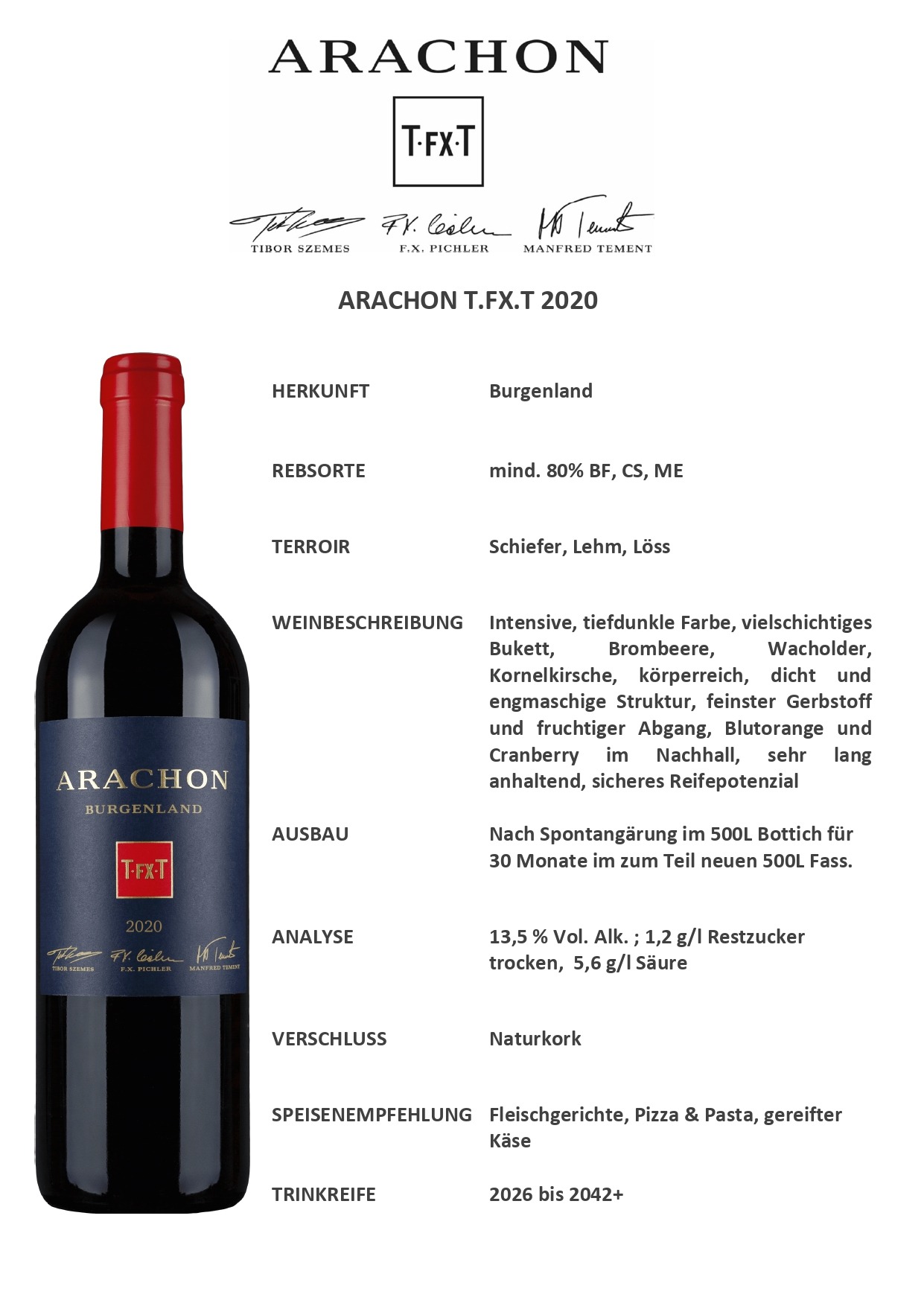 ANALYSE: 13,5 % Vol. Alk. 1,2 g/l RZ trocken 5,6 g/l Säure